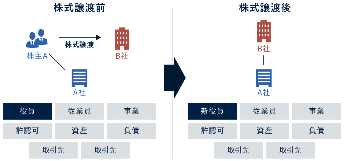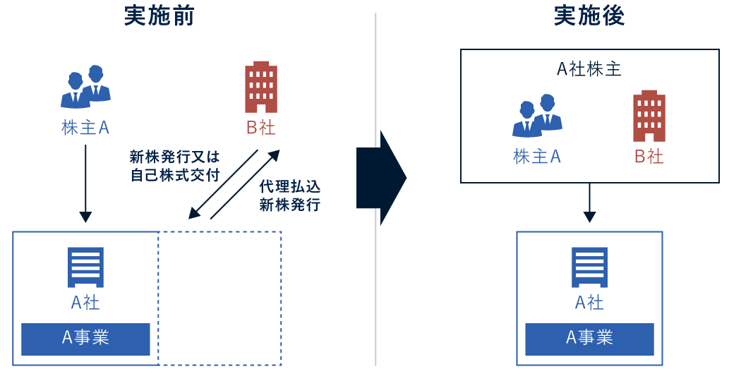株式は売買しないので、事業を売った会社(下の図のA会社)は買った会社(B会社)の子会社にならないのが、株式譲渡との大きな違いといえます。