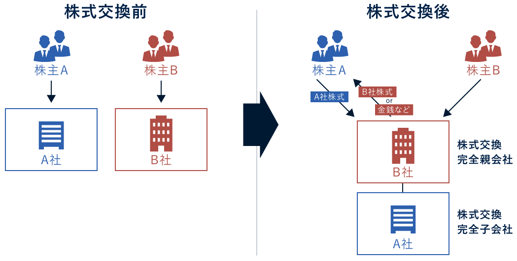 株式交換とは、金銭で株式を売買するのではなく、互いの会社の株式を交換することで子会社化するM&A手法です。下の図の場合、B社は株主AからA社株式を譲り受け、代わりに株主AにB社株式を譲渡します。これによって、B社はA社株式を全て保有することになり、A社を子会社化したことになります。