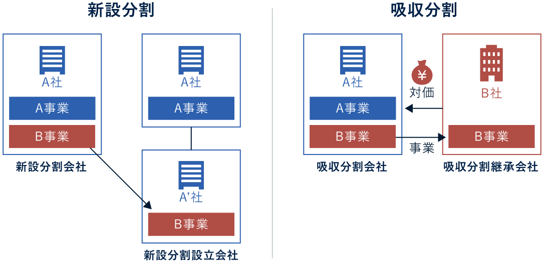新設分割は、事業を承継するための会社を新設して(下の図ではA'社)、新設会社に事業を承継する手法です。一方、吸収分割では、既存の会社(下の図のB社)が事業を承継します。会社分割は事業譲渡と似ている部分もありますが、事業譲渡が事業資産の売買であるのに対して、会社分割は事業の包括的な承継である点が違います。