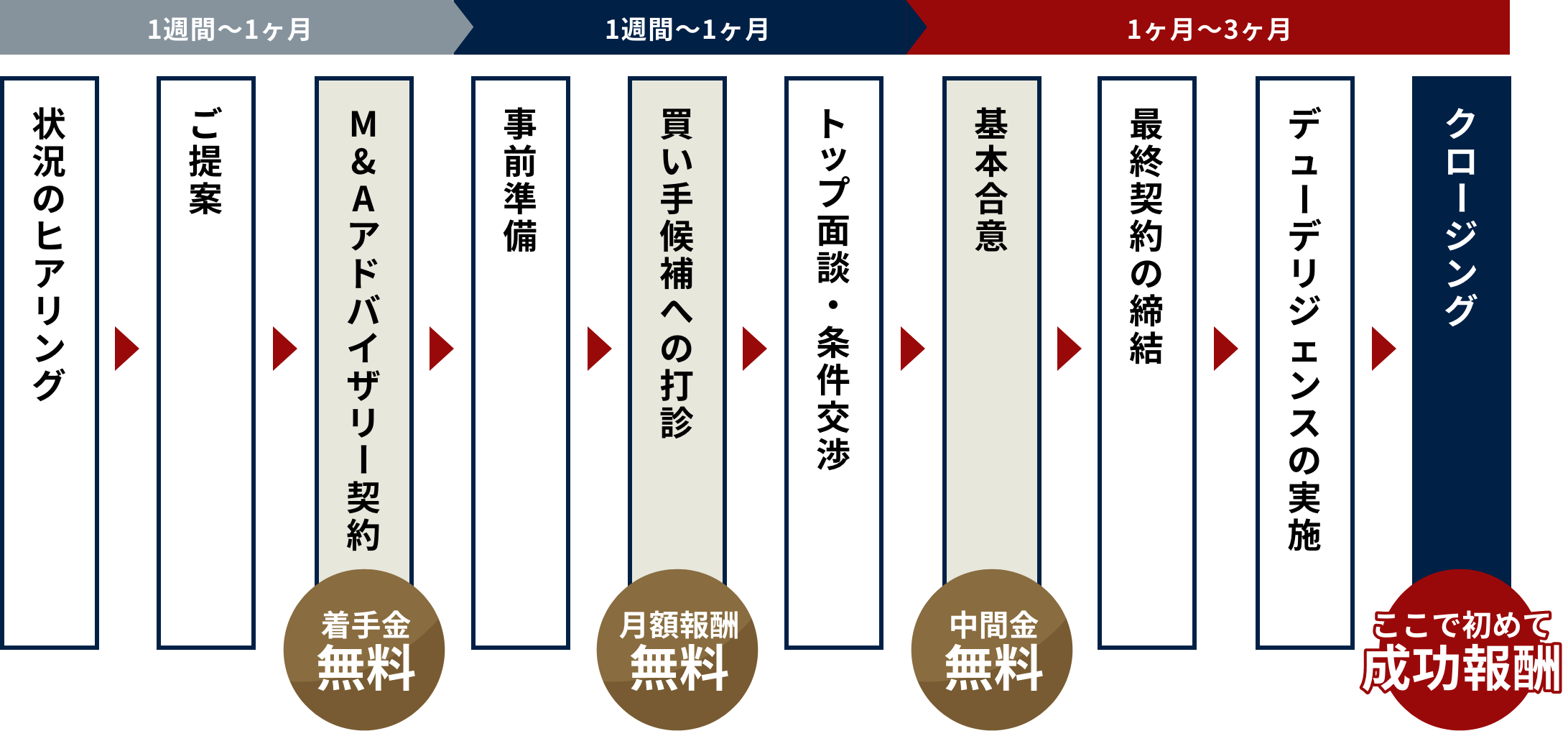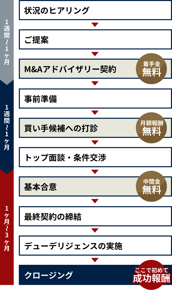 当社は譲渡企業様完全成功報酬制のため「1.着手金」「2.中間金」「3.月間報酬」が無料です。