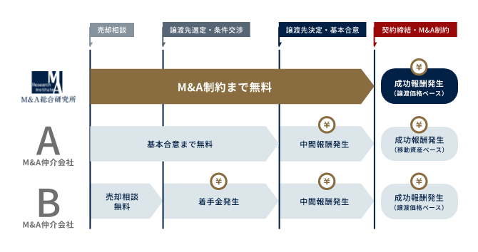 M&A総合研究所は、プライム上場企業唯一の完全成功報酬制を採用しています。着手金や中間報酬が発生しないので、焦らずじっくり企業を吟味いただくことが可能です。着手金の支払いが必要なために、検討を諦める企業も発生しないので、結果として幅広いご提案が可能になります。